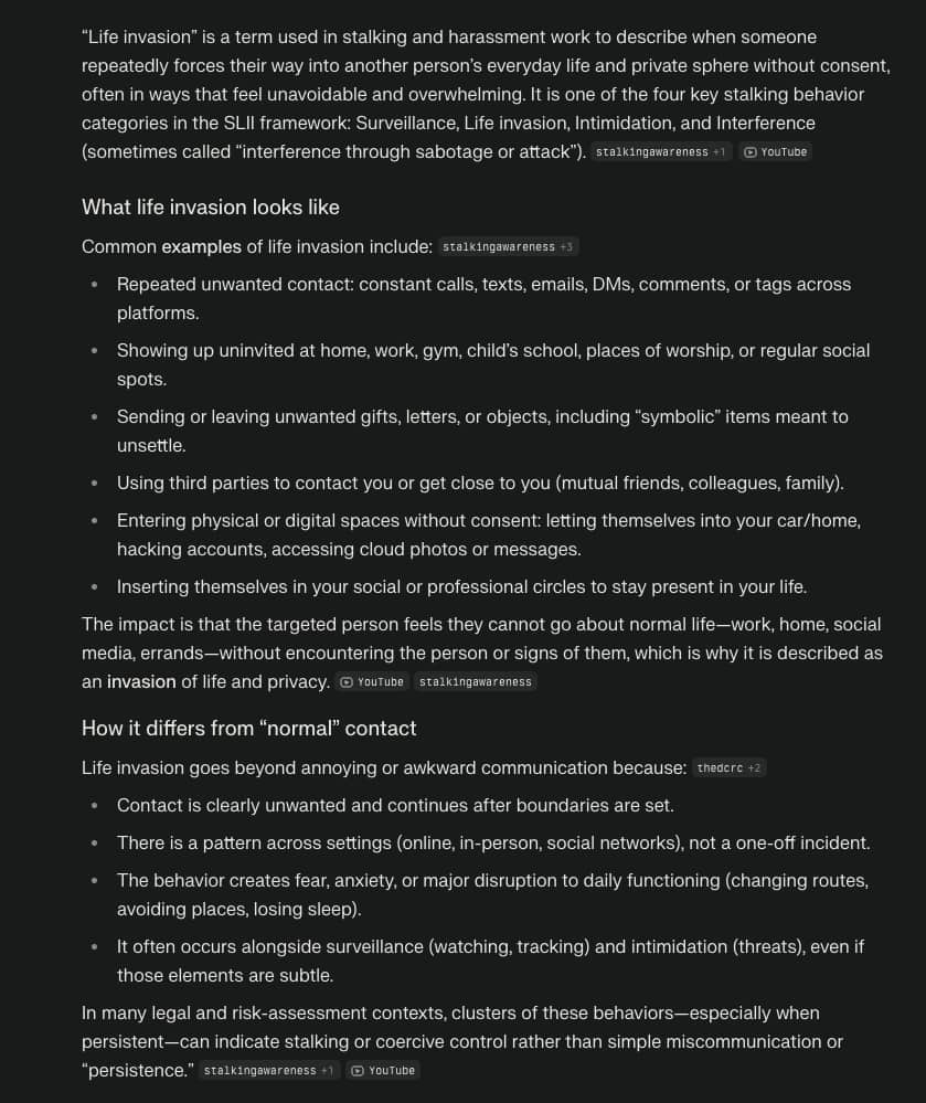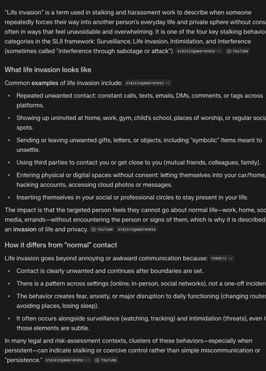 Going beyond the word Stalker and Stalking, the core action, beyond boundaries and paramiters is Life Invasion.