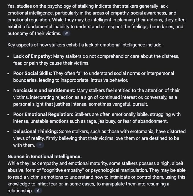 There could be a contrast of being psychology abusive behind closed doors but appearing to have victimhood in public. Female stalkers, as female psycopaths are harder to spot, being less overt. Study the people around them, how they act on their behalf. The cover-up action is not over nothing, it is over something the cant be controlled on their terms, a need to control other peoples percetion is a give away what they were doing before fear of exposure.