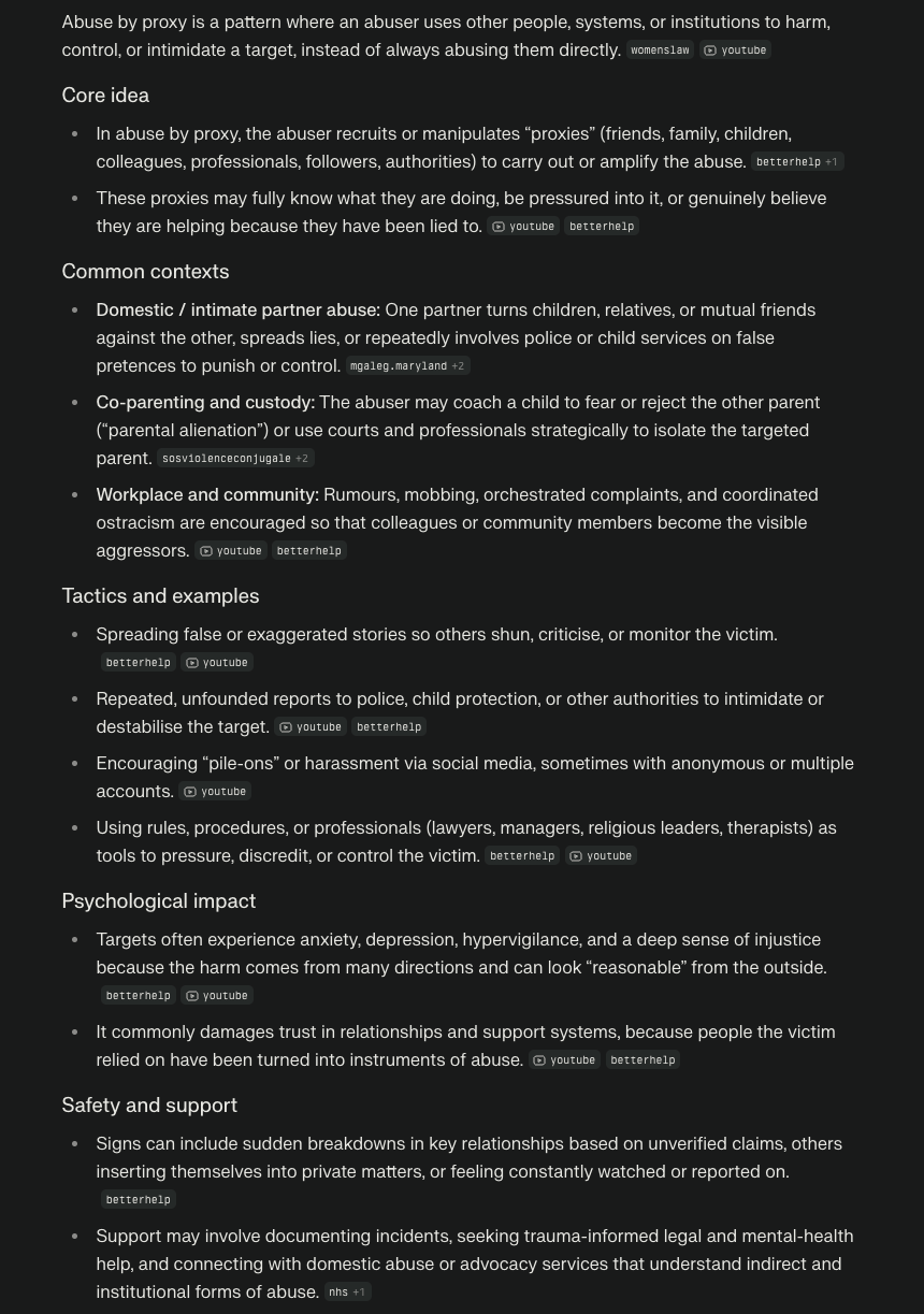 The proxy element - The lesser self-aware who will put their head in the oven when asked to, clearly can't think for themselves. The action defines a hidden person who has a serious internal issue that the victim may already be aware of. It may take others (flying monkeys, goons) years to see they have been fooled. Lega,lly they trade places with the core perpetrator; they are now the perpetrator. Document everything and report the abuse by proxy as a separate case. They will need to confess who influenced them and why, and take the crime the commited in the same way.
